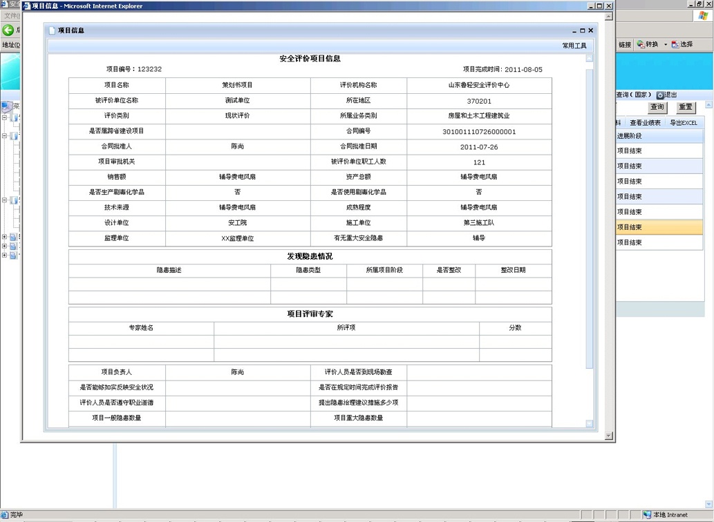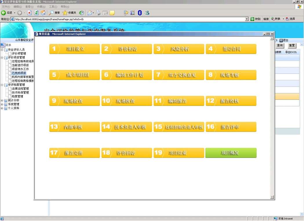 按照安評過程控制標(biāo)準(zhǔn),結(jié)合安全評價機(jī)構(gòu)的日常工作流程,對安全評價整個過程進(jìn)行網(wǎng)絡(luò)化地控制和監(jiān)管,根據(jù)風(fēng)險分析、實施評價、報告審核、技術(shù)支撐、作業(yè)文件、內(nèi)部管理、檔案管理和檢查改進(jìn)八要素對所有評價項目過程進(jìn)行嚴(yán)格把關(guān),要求安全評價機(jī)構(gòu)將現(xiàn)有項目的進(jìn)度情況及時上報到系統(tǒng)中,規(guī)范安全評價機(jī)構(gòu)工作流程,實現(xiàn)安全評價過程控制的信息化,在方便安全評價機(jī)構(gòu)內(nèi)部管理的同時有利于監(jiān)管部門對安全評價機(jī)構(gòu)的評價行為進(jìn)行實時動態(tài)的監(jiān)督管理。