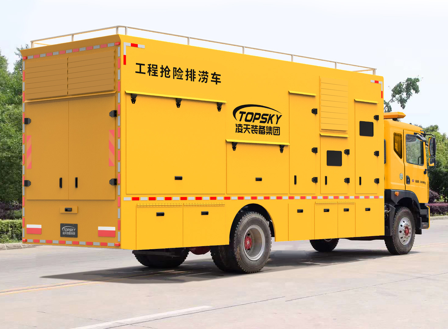3.整車(chē)布局合理分電源動(dòng)力區(qū)、指揮休息區(qū)、設(shè)備操作區(qū),整車(chē)不超重、排水流量大;