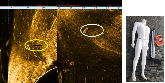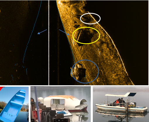 其中,藍(lán)色箭頭指向藍(lán)色線條為自動(dòng)檢測(cè)的水底線,三艘沉船,分別對(duì)應(yīng)實(shí)物如下,小船約為3米長(zhǎng),大船約為5米長(zhǎng)。